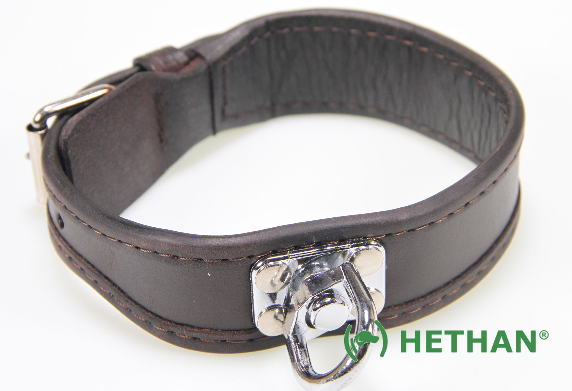 Hochwertige Schweißhalsung aus Leder für die Arbeit auf der roten Fährte. Die Halsung ist breit gearbeitet, um möglichen Druck am Hals gering zu halten. Der Drehwirbel verhindert, das Verzwirbeln des Schweißriemens. Besonders komfortabel für den Jagdhund, da alle Kanten mit weichem Leder doppelt umgelegt sind.